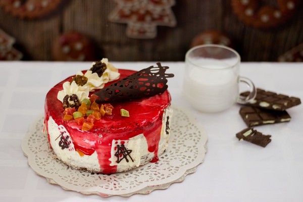 Торт на основе нежного бисквита, прослоен кремом из взбитых сливок с кусочками ананаса и косточками абрикоса.